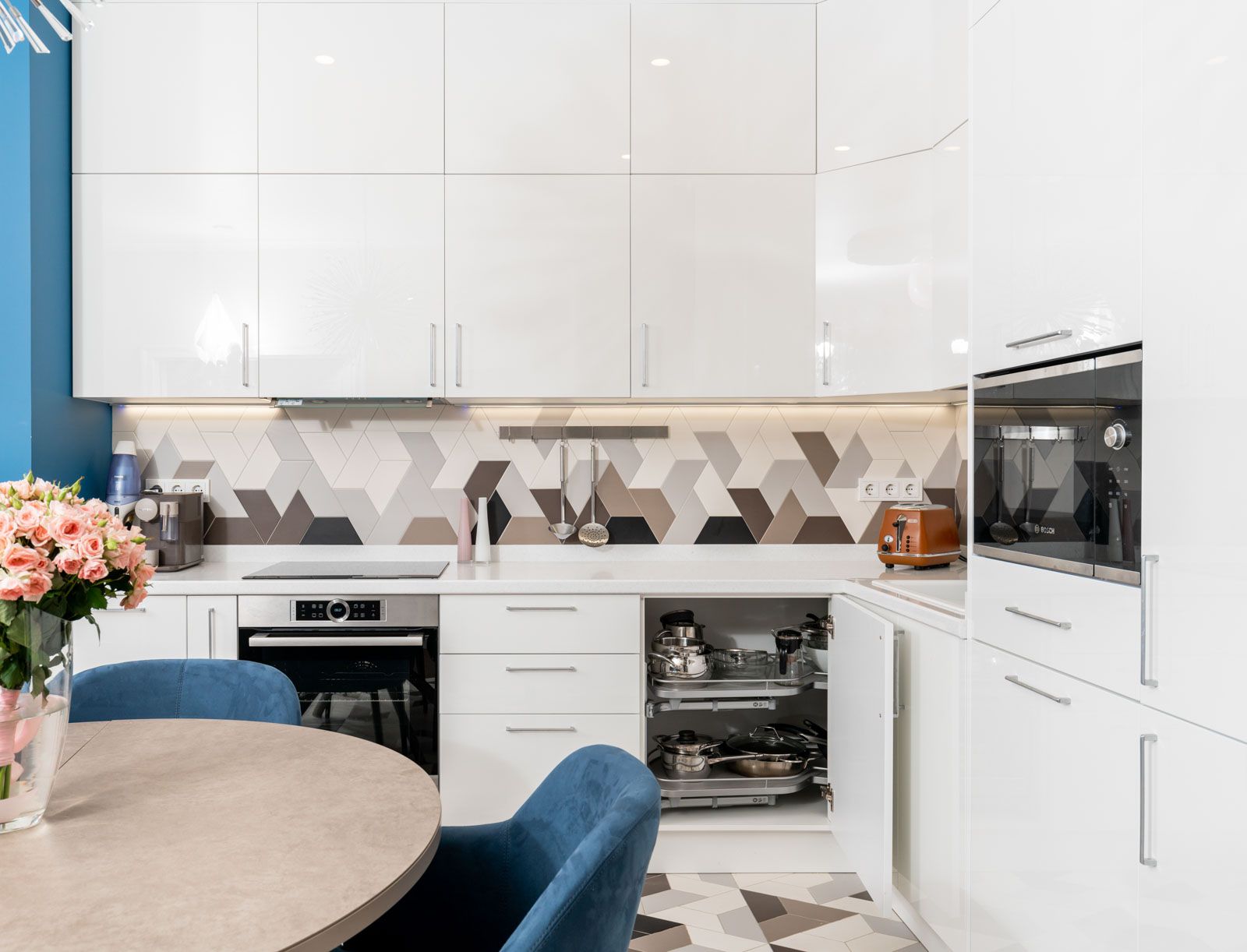 Строительные работы в квартире Анны еще не начались, когда в гости на новоселье ее пригласила подруга — дизайнер одежды Маша Цигаль. Там актриса и увидела кухню Вектор от фабрики «Мария». Хорошего вкуса и умения выбирать качественную мебель у нее не отнять! Для себя Анна выбрала гладкие глянцевые белые фасады. Очень красивое, удобное и практичное решение, а кроме того, мировой тренд в дизайне интерьера.